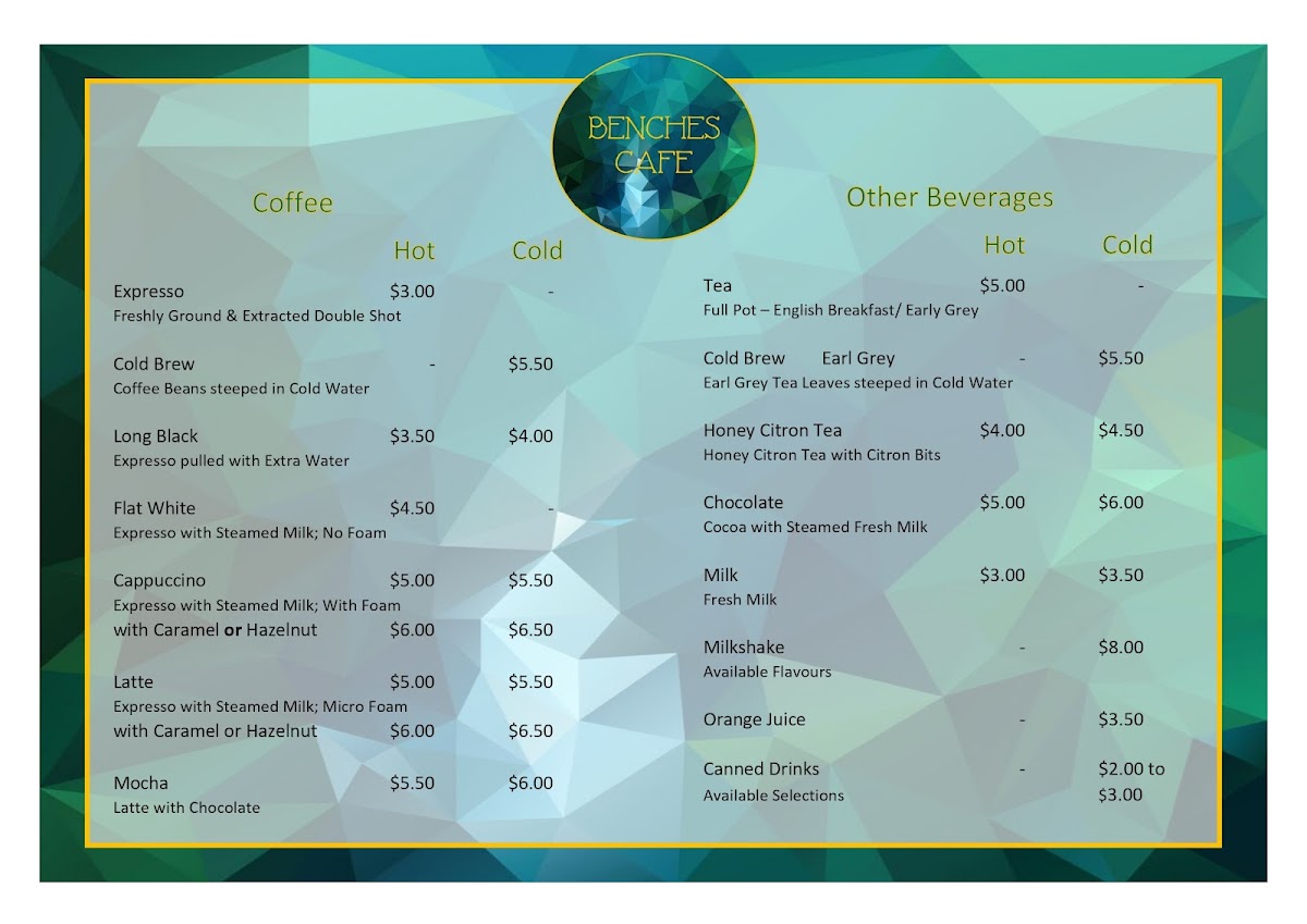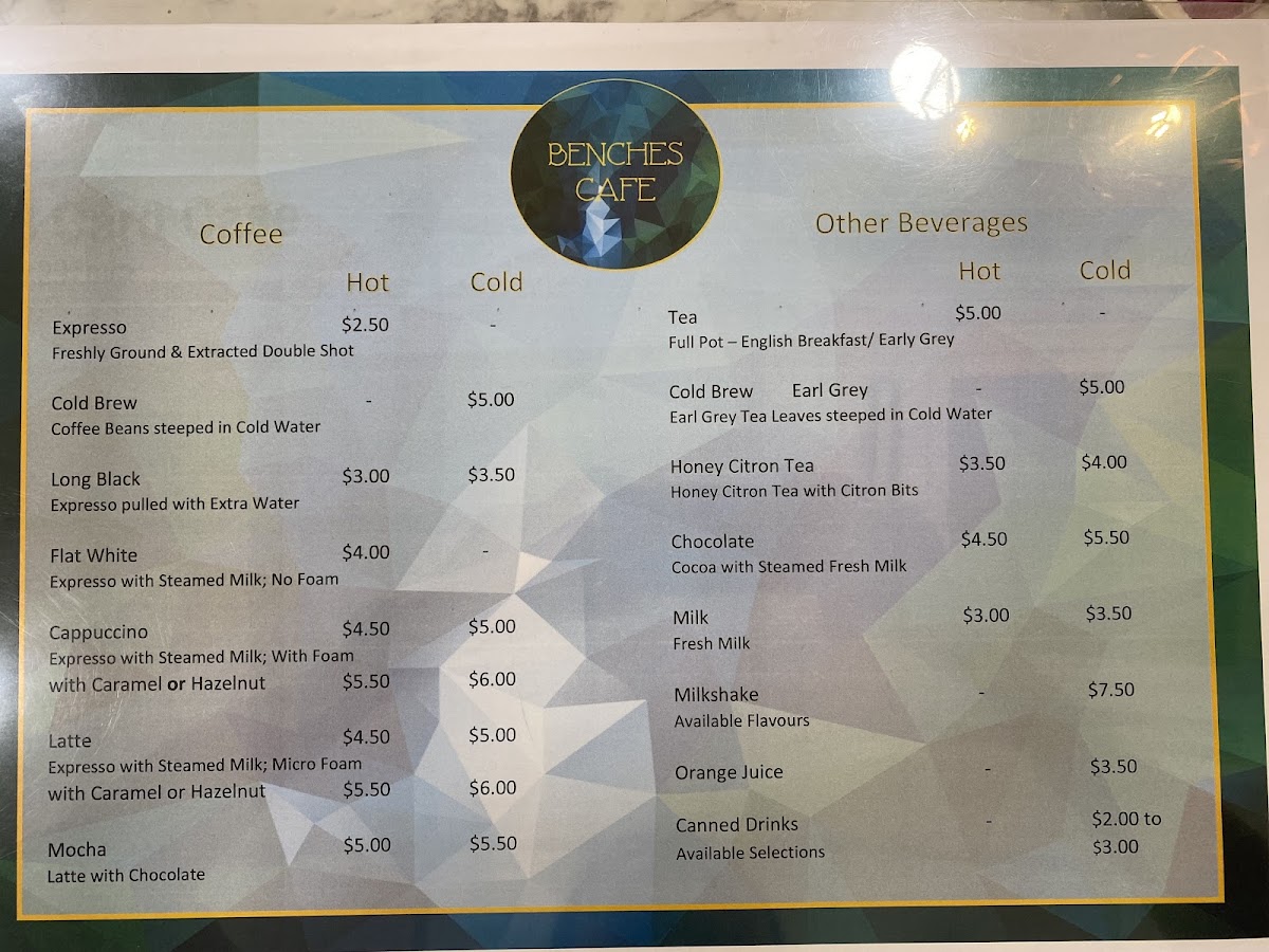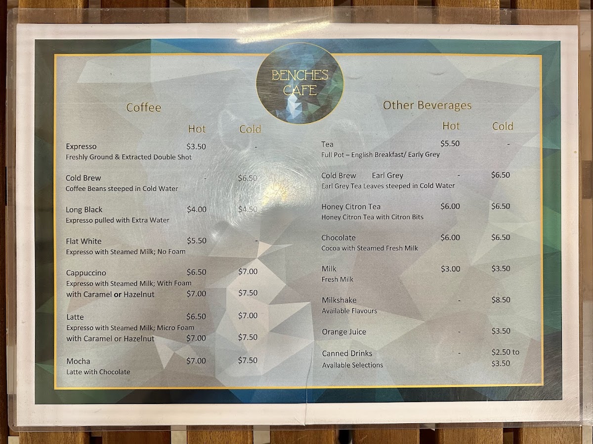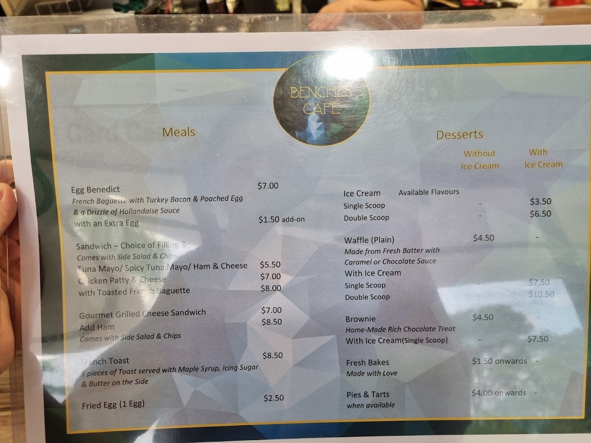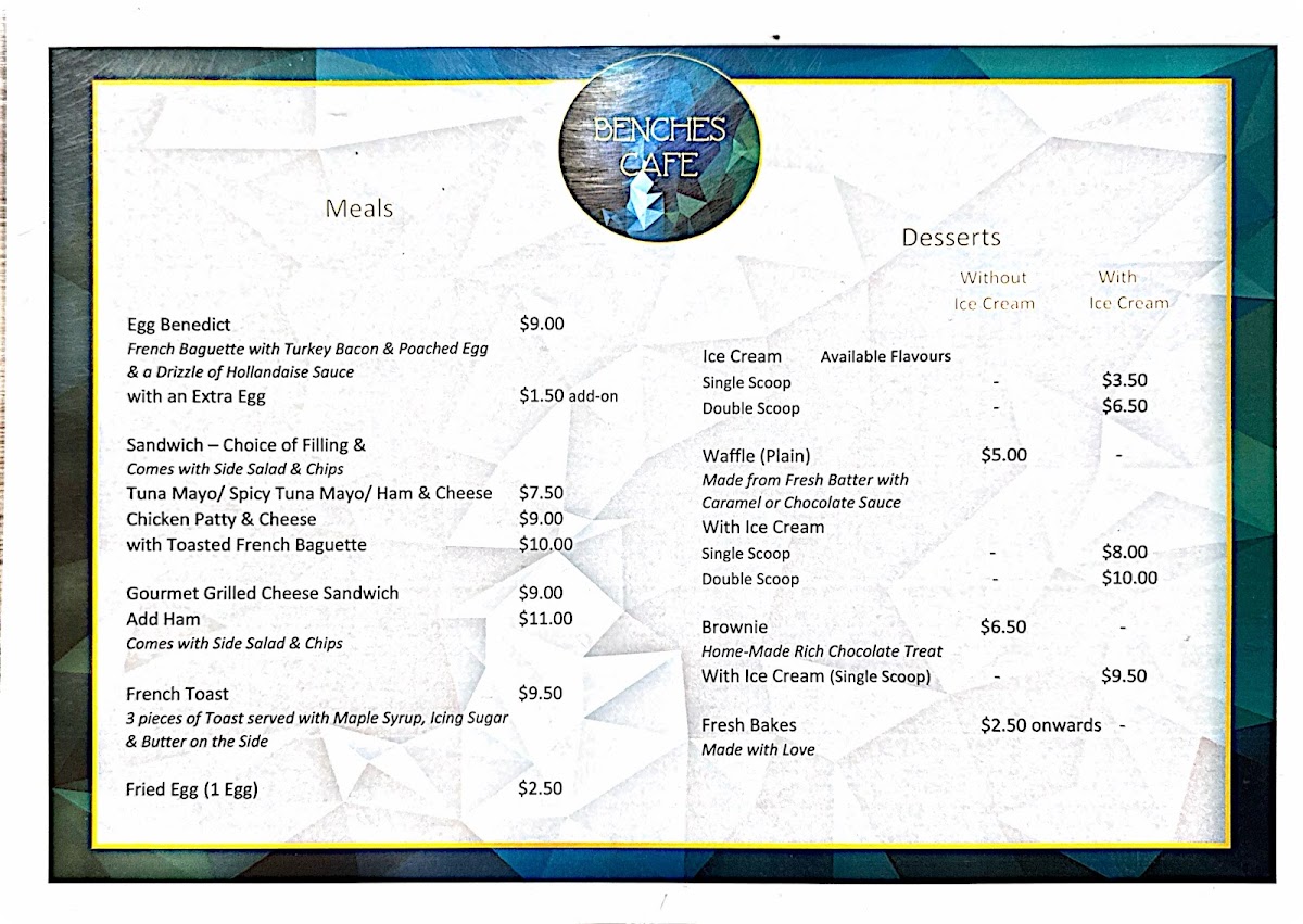 The menu at Benches Cafe features a selection of light meals and beverages suitable for breakfast, coffee breaks, and casual dining. Offerings include a variety of sandwiches such as the classic grilled cheese and ham sandwich, and a gourmet grilled cheese sandwich. Egg-based dishes like Eggs Benedict are also available. For those seeking sweet options, the menu includes waffles served with ice cream, French toast, and desserts like brownies with ice cream.